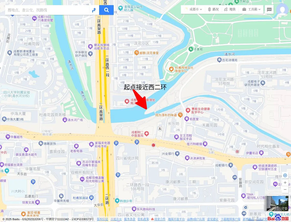 从肖家河的终点,即汇入锦江的天府大道附近,骑行到起点,即肖家河分清水河分出的西二环附近,骑行距离约19公里。