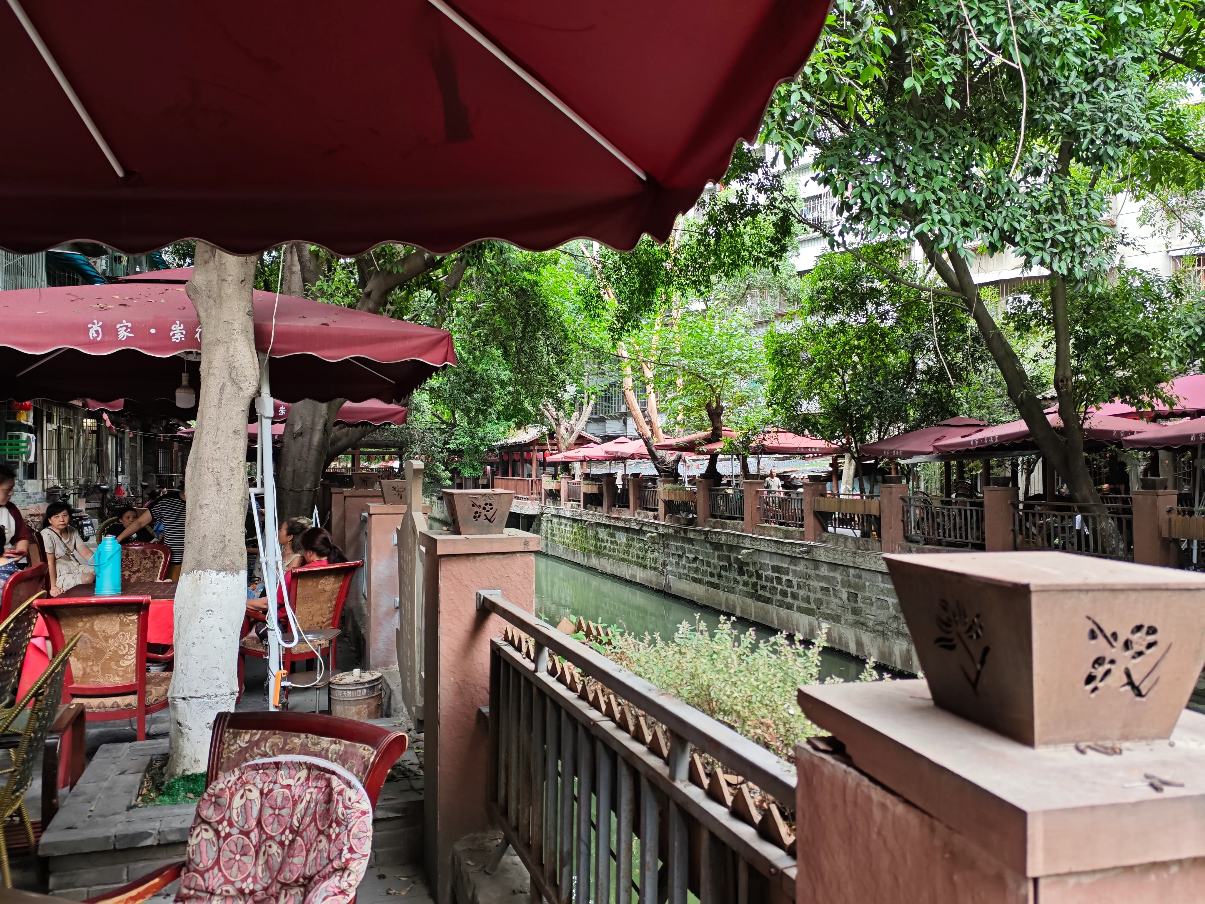 过了南二环,可以看到祟德园,一个著名的河边喝茶地。据说名气已经超过人民公园了。成都没有一条河能逃过河边茶铺,哪怕小到肖家河。这一带边上多是老旧的居民楼,第一层多为底商,所以形成了喝茶聚集地。新的小区不会有这情况了。